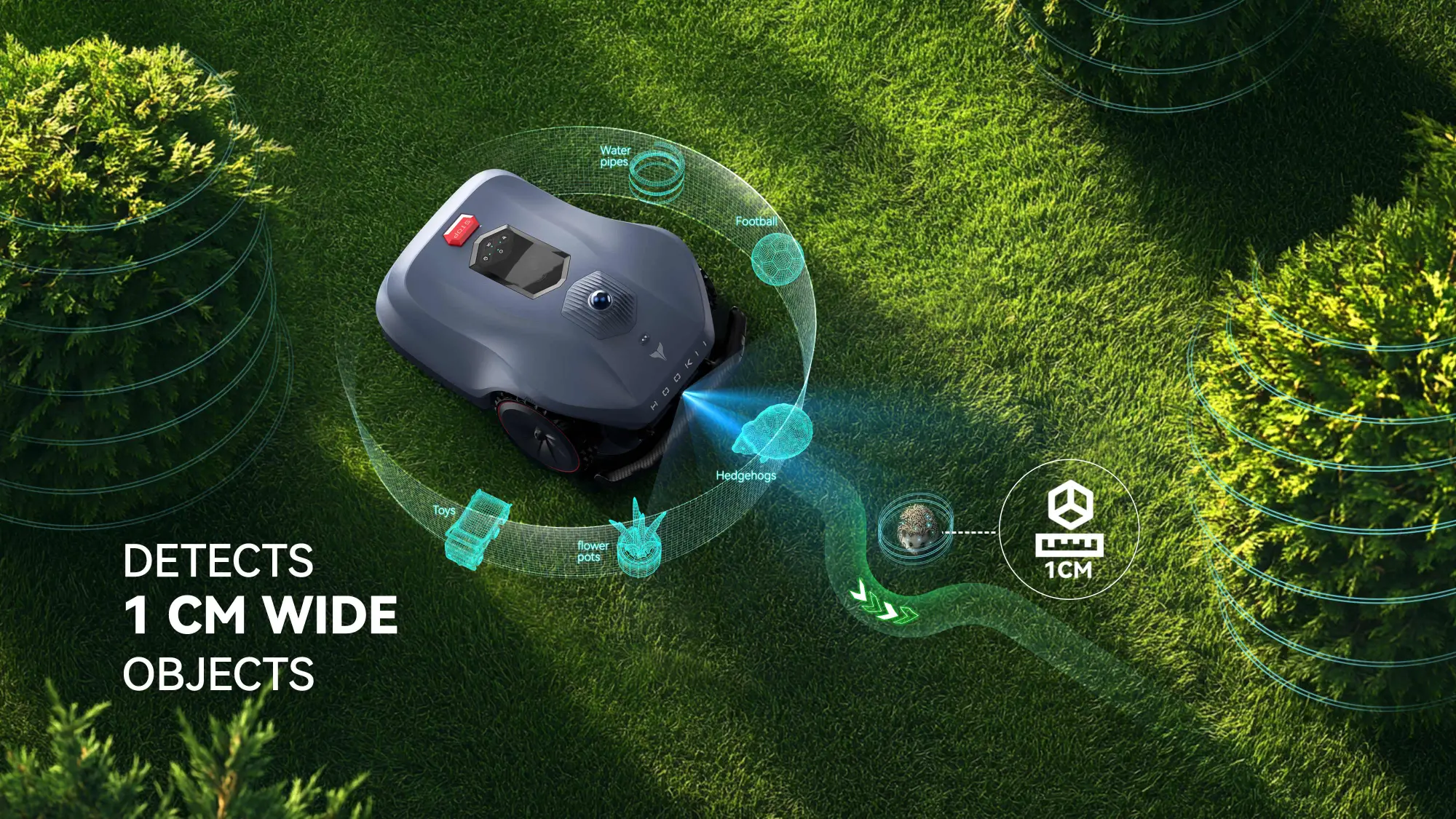 Handles slopes, narrow passages, and complex lawns with ease.